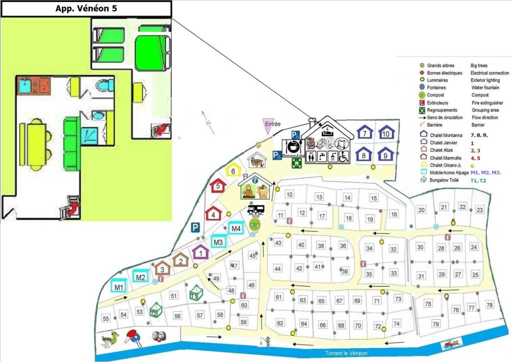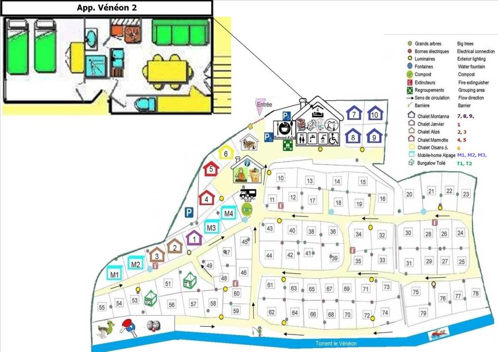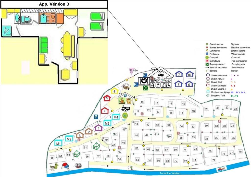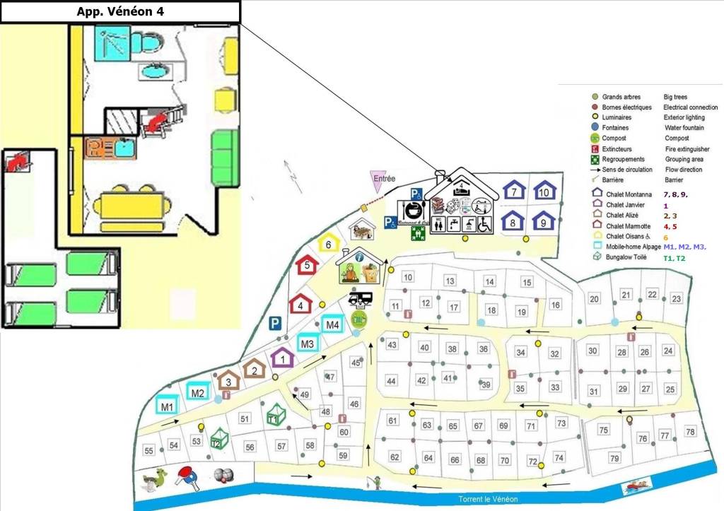 Le chalet Oisans est situé au cœur du camping à portée de main de tous les services du camping.